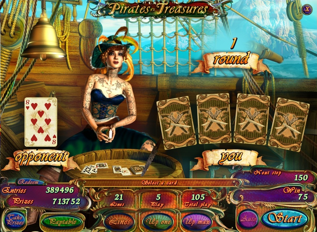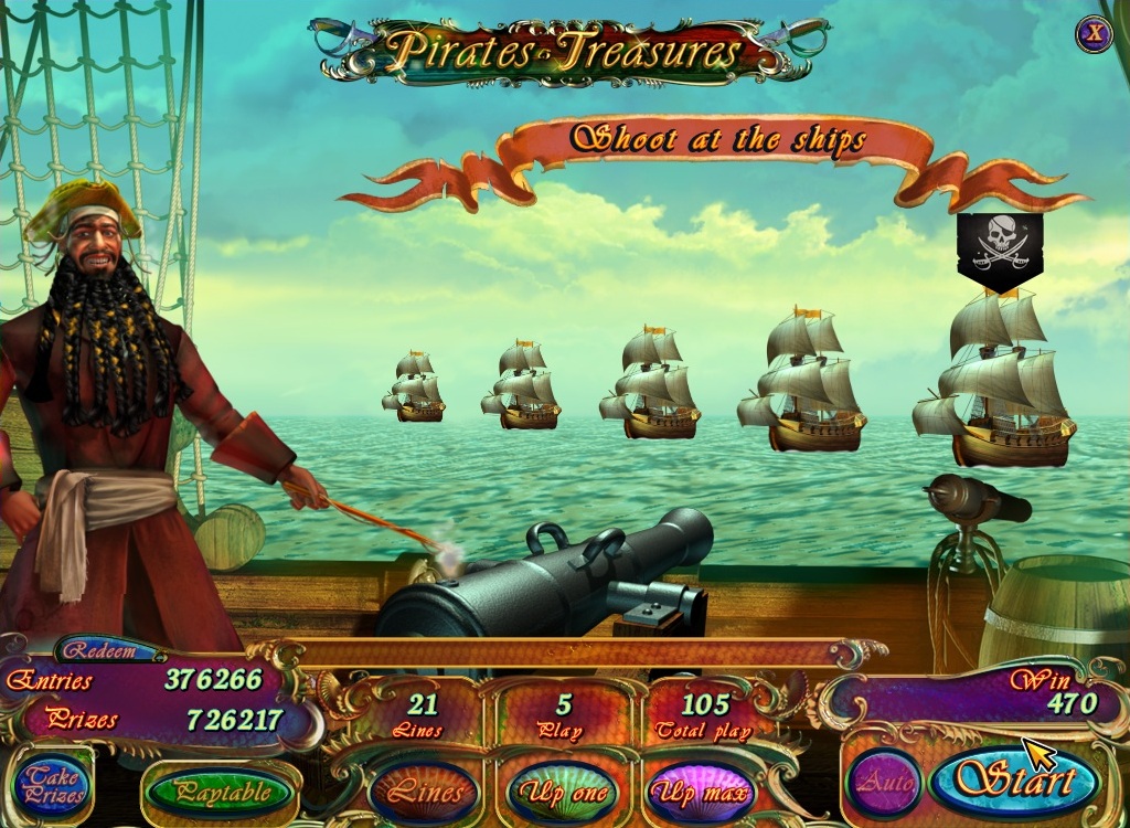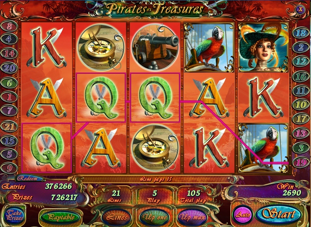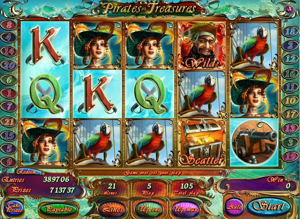 ame Pirates treasures is 5 reel 21 line video slot with bonus game, free spins and an opportunity to double your winnings. Wild symbol substitutes for any symbol except the scatter and bonus symbols in winning combinations.