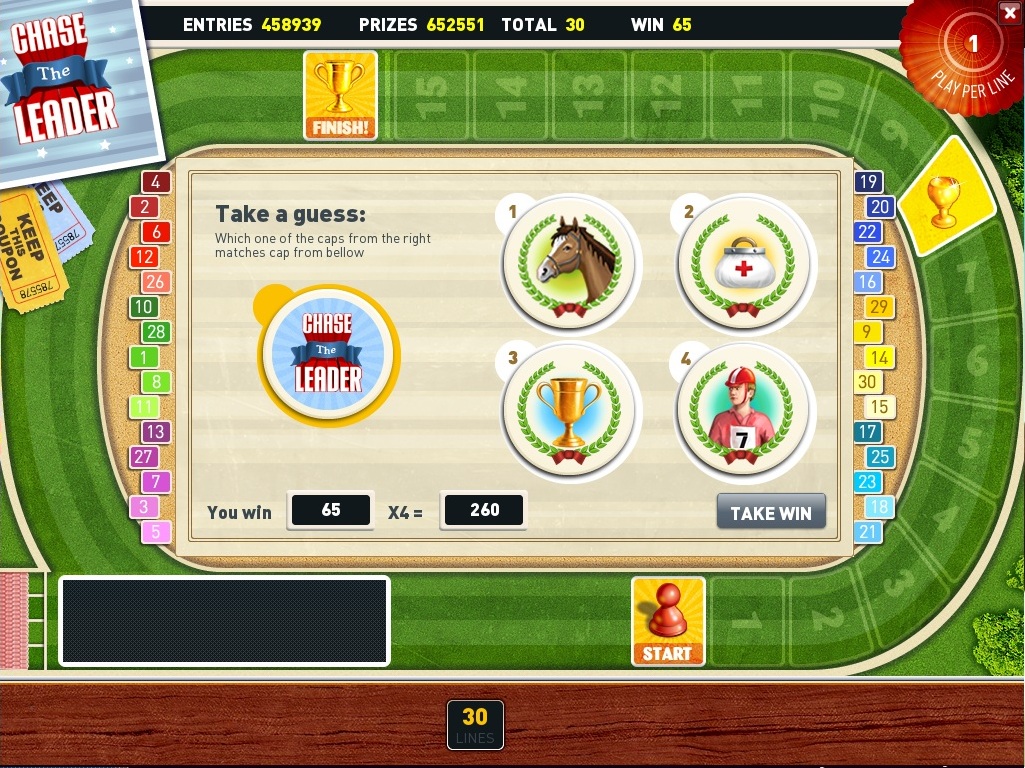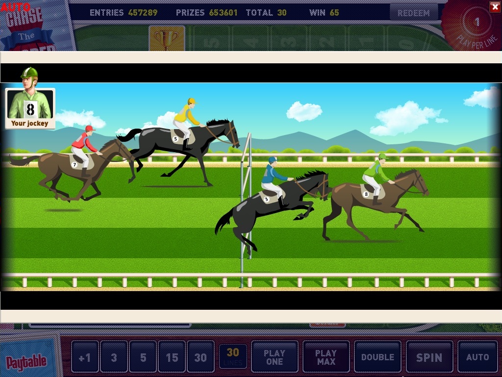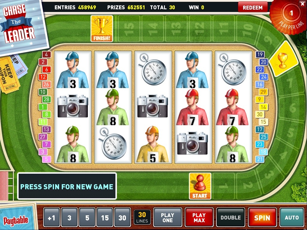 Chase the leader is a 30 line, 5 reel video slot with the possibility of increasing the risk of his winnings to the game, a bonus game and free spins. The "kit" replaces any symbol in a winning combination except "Bonus" and "Scatter" symbols.